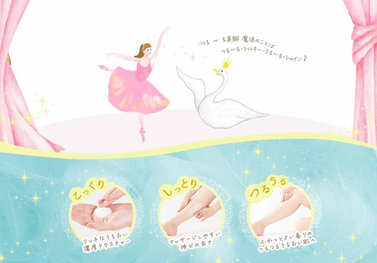 つる~る美脚 魔法のことば「つる~る・シルキー・うる~る・シャイン」を唱えながら、脚をマッサージするように塗って、つるうる美脚を目指しましょう♪