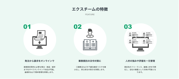 エクスチームとは、「external:外部の、外の」と「team:チーム、仲間」とを組み合わせた名称で、フリーランス・副業人材などの外部人材を活用している企業向けの業務委託契約管理に特化したツールです。発注から納品、請求までを一元管理し、業務委託内容や実績を全て可視化します。フリーランス・副業人材とのやり取りを集約・管理することで、請求漏れや契約書紛失なども防ぎます。また、外部人材情報をデータベース化することにより、業務委託先の発注履歴や報酬額、評価などを社内共有できるタレント管理機能も有しています。