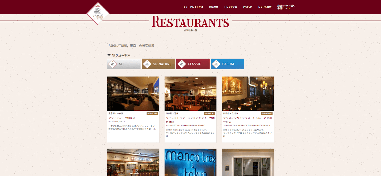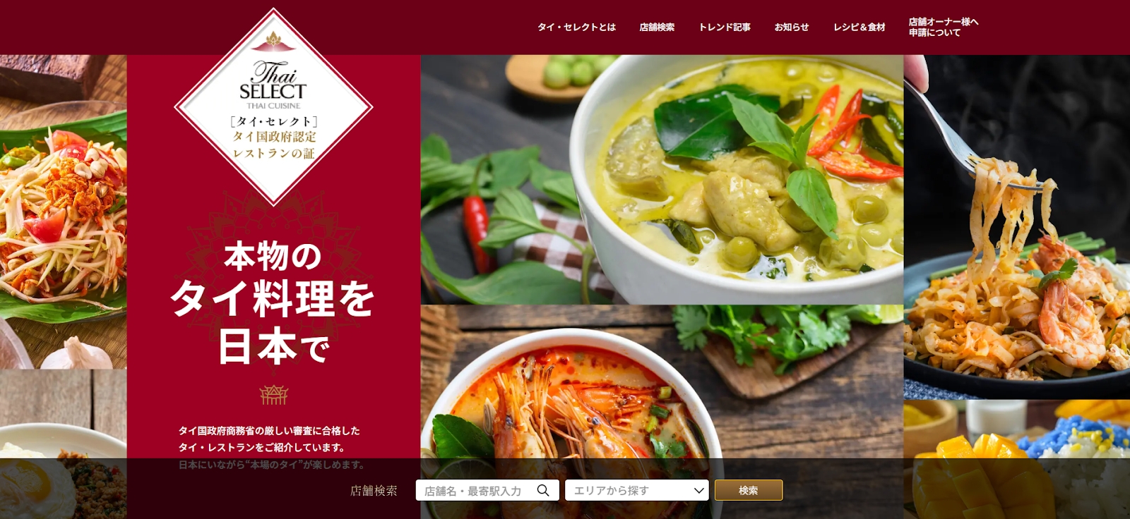 タイ・セレクト公式サイト( https://thaiselect.jp/about/ )では、タイ国商務省の厳しい審査に合格した、日本国内にあるタイ・セレクト認定レストランを全店舗紹介しています。実際に足を運び、本場のタイ料理をぜひお楽しみください。
