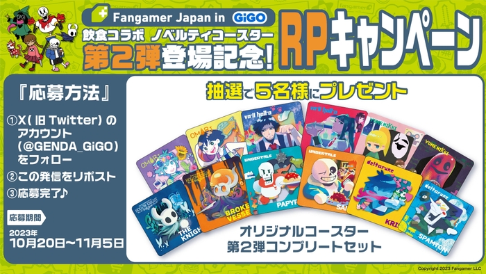 株式会社GENDA GiGO Entertainment(本社:東京都港区 代表取締役社長:二宮 一浩 以下当社)は、「Fangamer Japan in GiGO」での飲食コラボ(ゲーマー焼き、ゲーマードリンク)で提供しているオリジナルコースターを2023年11月1日(水)から新デザインに切り替えいたします。