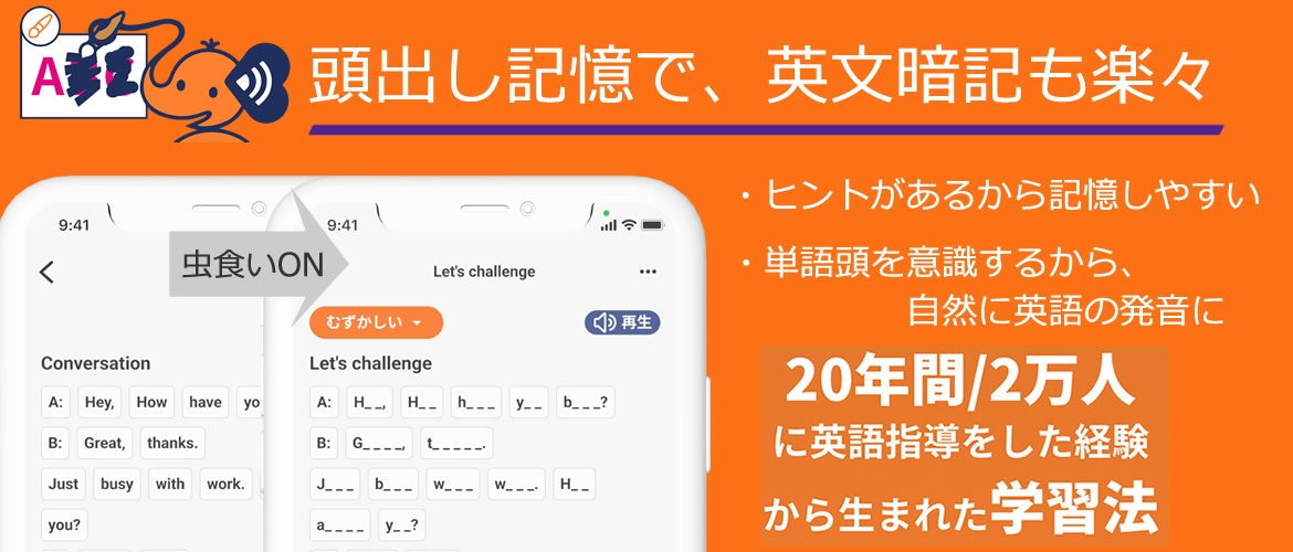 残されたヒントの語頭を頼りに、最終的に何も見ないで英文が口から出てくるように暗記。ゲーム感覚の虫食いで、あなたの“英語の引き出し”を増やすことが可能となります。
