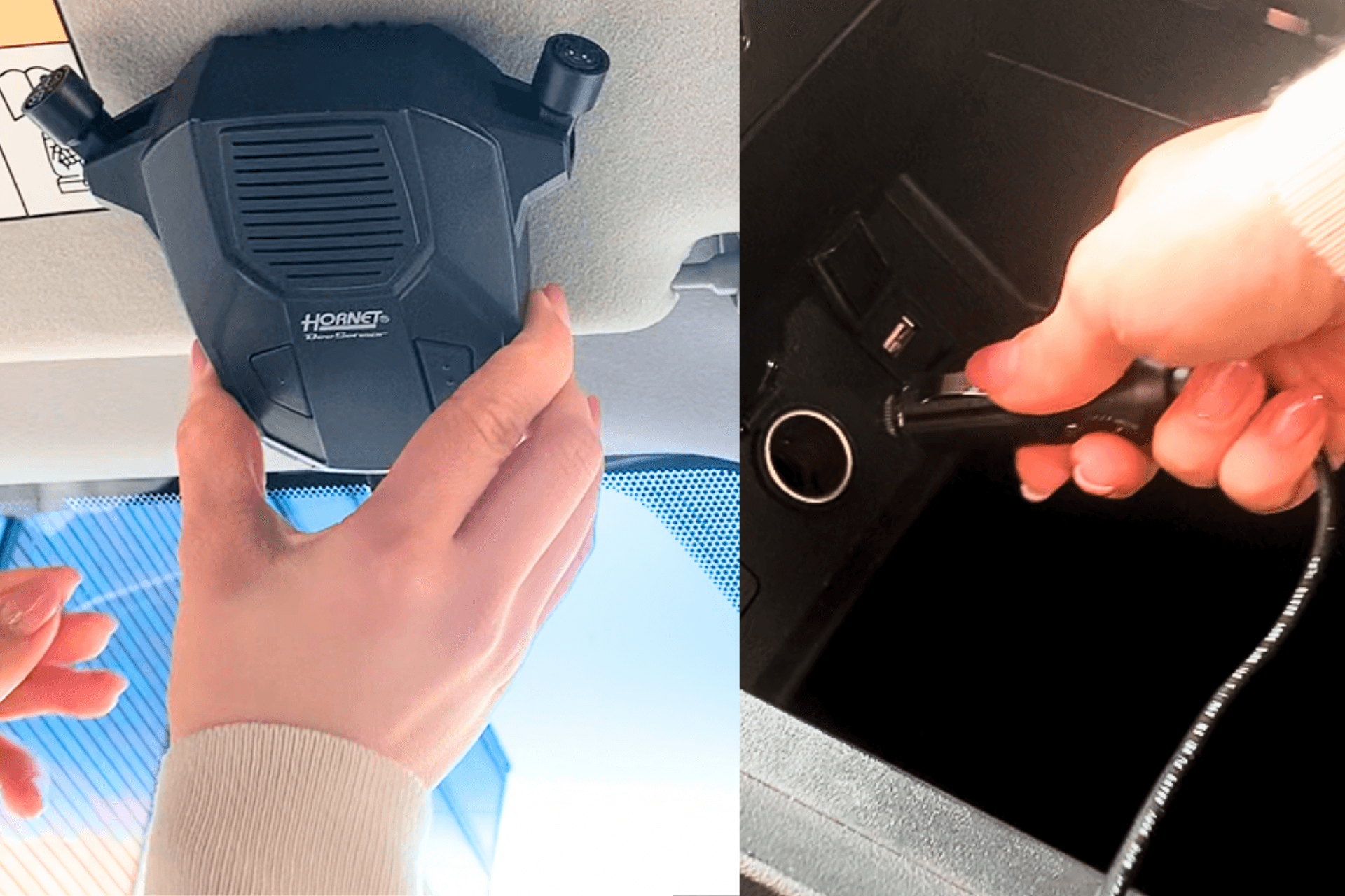 メインユニットをサンバイザーに設置し、電源をシガーソケットに差し込むだけで設置が完了するので配線工事が不要です。また、電源をシガーソケットに差し込むとエンジン作動中に自動的に充電されます。