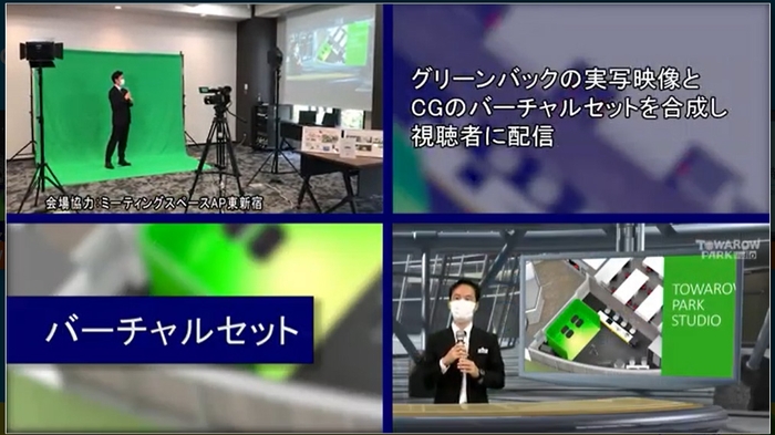 ⇒「TOWAROW PARK STUDIO」のグリーンバック背景を用いれば、CGのバーチャルセットや360度画像を合成することでその場にいるような臨場感ある映像をつくることができます。