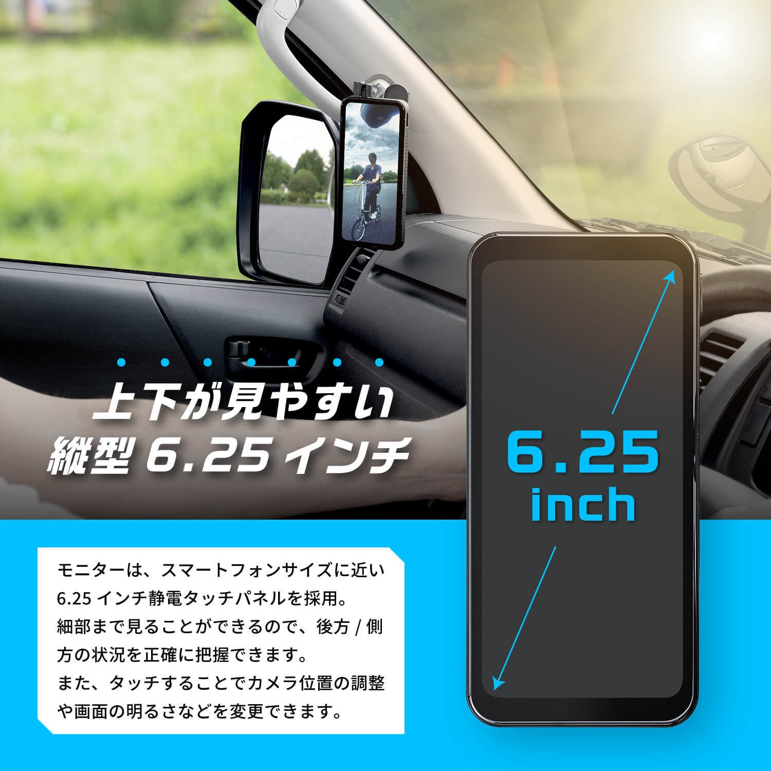 ● スマホサイズの6.25インチ液晶(112万画素)を採用し、色彩や路面の障害物をはっきりと確認でき、死角の状況を正確に把握できます。