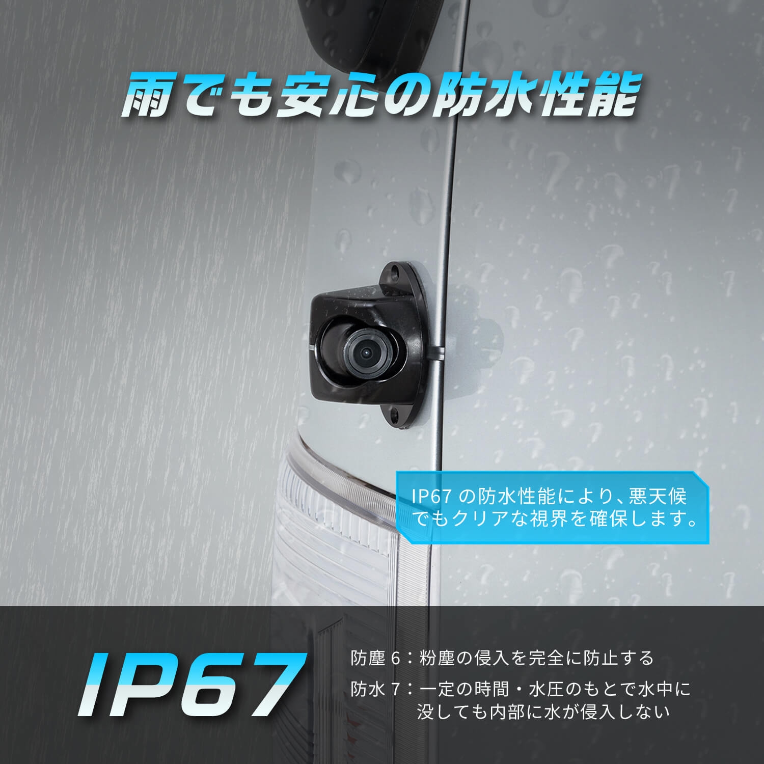● カメラレンズは角度調整が可能で、撮影角度を微調整できます。さらに、高フレームチューニング(50fps)により、滑らかな映像を実現し、IP67防水仕様で雨にも強い設計です。