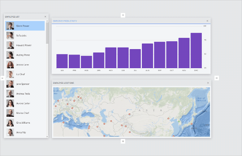 ウィンドウの位置やサイズをカスタマイズして最適なウィンドウレイアウトを作成できるコンポーネントです。デスクトップアプリのような操作感で、開発された各種ウィジェットをWebブラウザ上でピン固定したりドッキングしたりとユーザーが作業内容に合わせてワークスペースを自由にカスタマイズすることができるので、作業を効率化することができます。