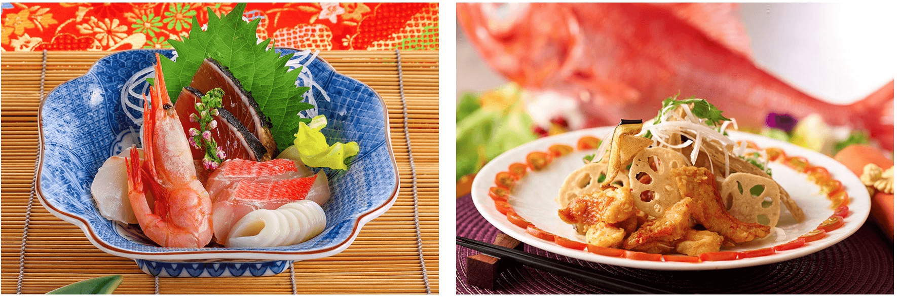 右:金目鯛を使った中華の一品「金目鯛の唐揚げ 中華風香味だれ」。ふわふわの身とからりと揚がった衣に甘辛のたれが絡む、お箸の止まらなくなる美味しさをご賞味ください。