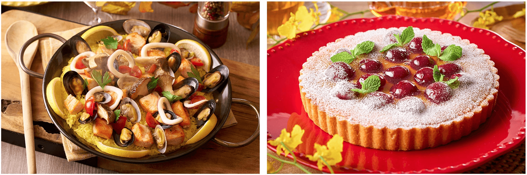 左:栃木県産きのこと魚介のパエリア。具材から出る旨味が染みたサフランライスとたっぷり具材をお楽しみください。
