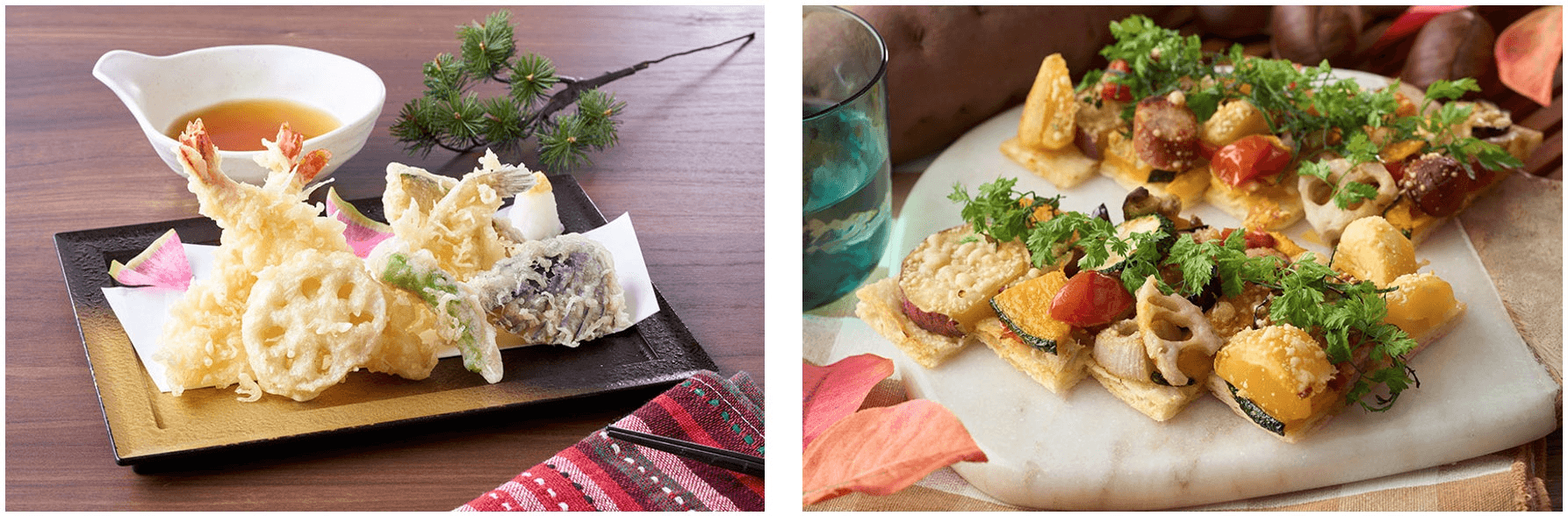 左:五郎島金時、加賀れんこんなど石川県産の野菜を使った天ぷらもライブキッチンから揚げたてをご提供いたします。