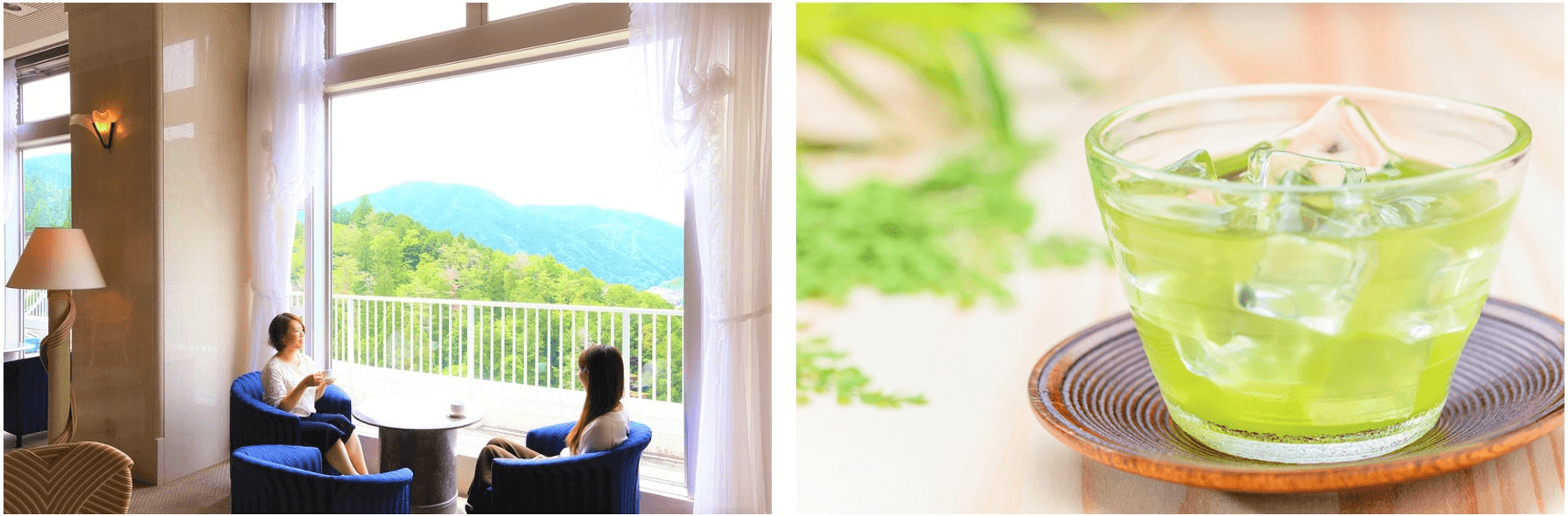 そんな日光霧降のラウンジサービスの魅力のひとつは「湯上りラウンジ」。最上階に設えたラウンジの大きなガラス窓の向こう、眼下に広がる雄大な自然を眺めながら、お風呂上りの冷たいビール、朝風呂の後のコーヒーを、時間と共に変化する霧降高原の自然と共にお楽しみください。