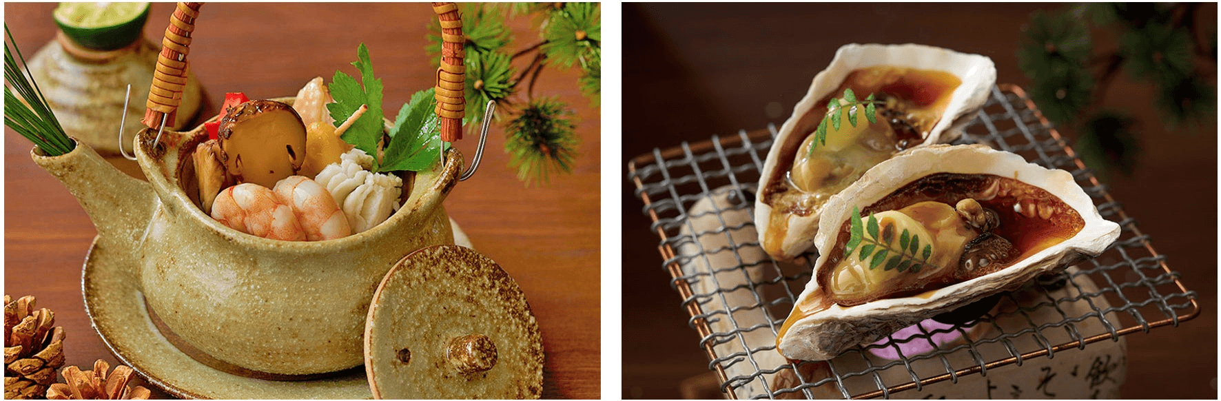 左:山下家、秋の名物メニュー「松茸土瓶蒸し」。土瓶に出汁を張ってテーブルで炊き上げて。温かな湯気と立ち昇る香り、そして具材の旨味が染み出た出汁をじっくりとご堪能ください。
