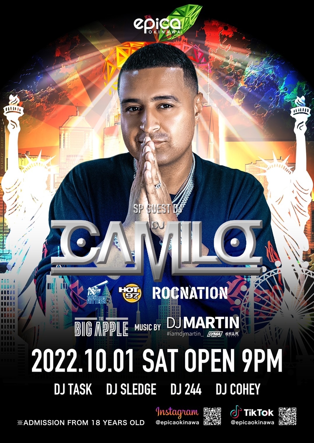 沖縄の那覇市松山ナムラプラザビル3階で運営する、320坪の国内最大規模のナイトエンターテインメント【Club epica】。世界有数のDJ/タレントブッキングエージェンシー、“SKAM Artist”に所属するDJ MARTINプロデュースのパーティー、『The Big Apple』にNYを拠点に世界中を飛び回る海外のスーパースター、DJ CAMILOが沖縄エピカに10月1日に出演決定!海外主流のオープンフォーマットスタイルは必見、NYのトレンドを体感せよ。