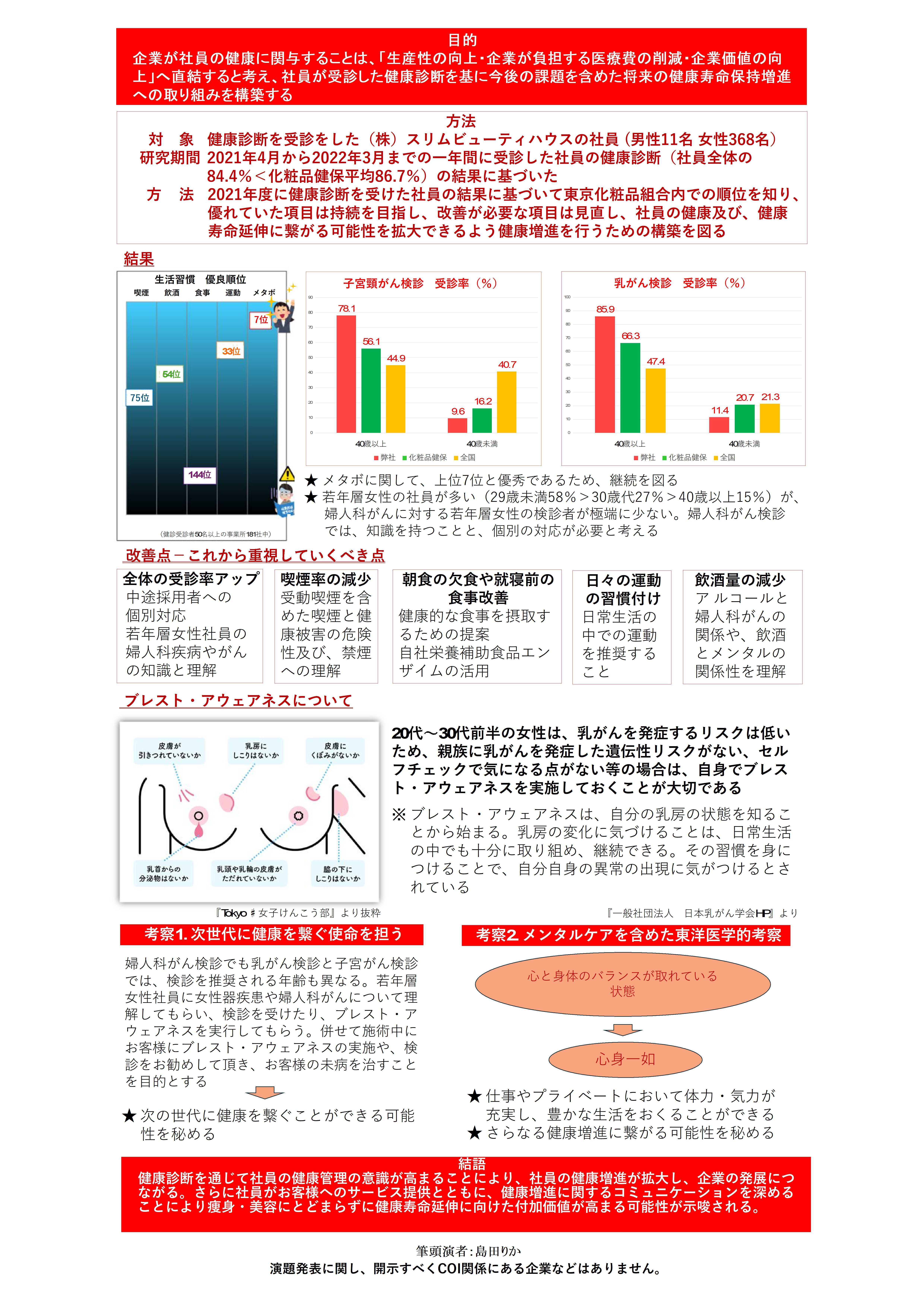 健康診断を通じて社員の健康管理の意識が高まることにより、社員の健康増進が拡大し、企業の発展につながる。さらに社員がお客様へのサービス提供とともに、健康増進に関するコミュニケーションを深めることにより痩身・美容にとどまらずに健康寿命延伸に向けた付加価値が高まる可能性が示唆される。