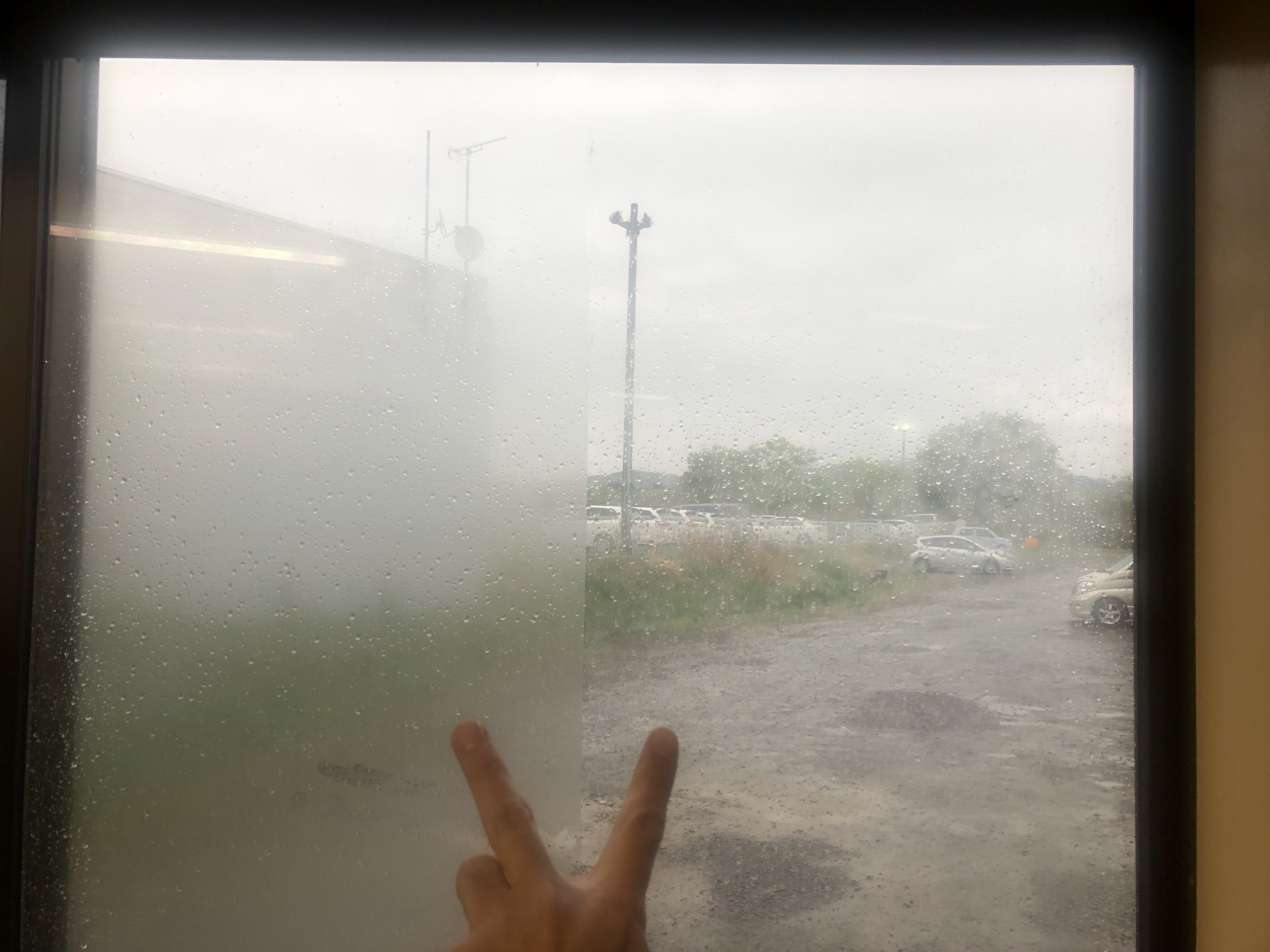 高層オフィスビルでは、梅雨時や冬に大きな窓ガラスが曇り、また社員が1フロアに100人近くいるため吐いた息が窓ガラスに結露して窓が曇った状況が続いていました。大きな窓ガラスからも外の景色を見られなくなり、また衛生的にもガラスに付いた結露は悪く、対応を探していました。そこで窓ガラス一面だけに貼って試してみると貼っていない窓ガラスとの違いに驚きました。また費用も高価で工期も長い換気設備をするより、安価で1日で作業完了と素早い為、結露防止フィルム貼りを依頼しました。