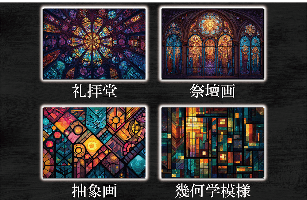 ステンドグラスの特徴的なビジュアルは活かしたまま、様々なコンセプトのデザインと組み合わせることで全く新しいアートにしました。何度も試行錯誤を重ねたAIの生成結果から、アクリルならではの光の美しさが際立つ20種を選んでおります。