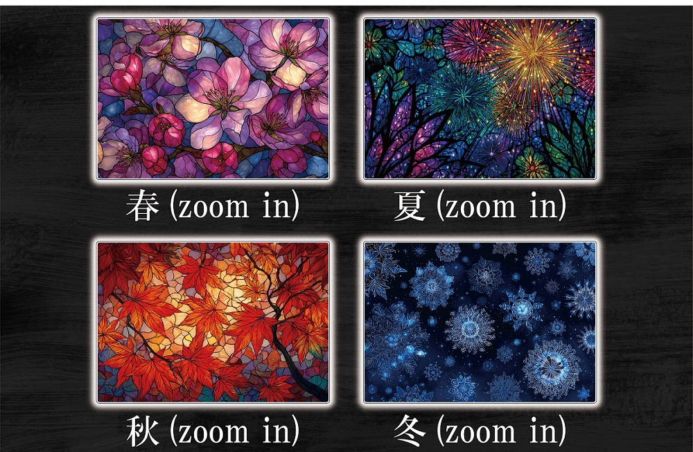 まるで本物のステンドグラスを思わせるデザイン、日本を象徴する景色や四季を表現したデザインなど全20種類を展開。AIデザインとアクリル加工技術により、ステンドグラスのような表現を、軽量かつ手に取りやすい価格で実現しています。