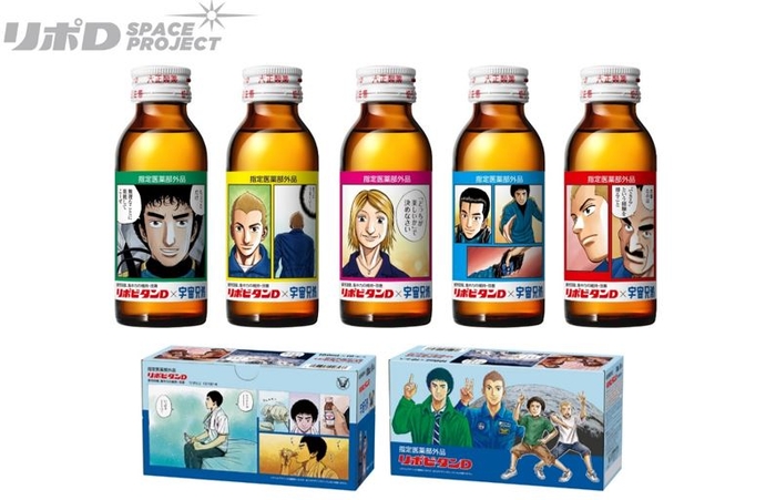 “リポビタンD 宇宙兄弟ボトル 第2弾”は、「宇宙兄弟」に登場する主人公たちの名言・名シーンをモチーフにしたラベルを貼った5種類のデザインボトルで、外箱(10本箱)は、小山宙哉氏によるリポビタンD×宇宙兄弟の描き下ろし画となっています。