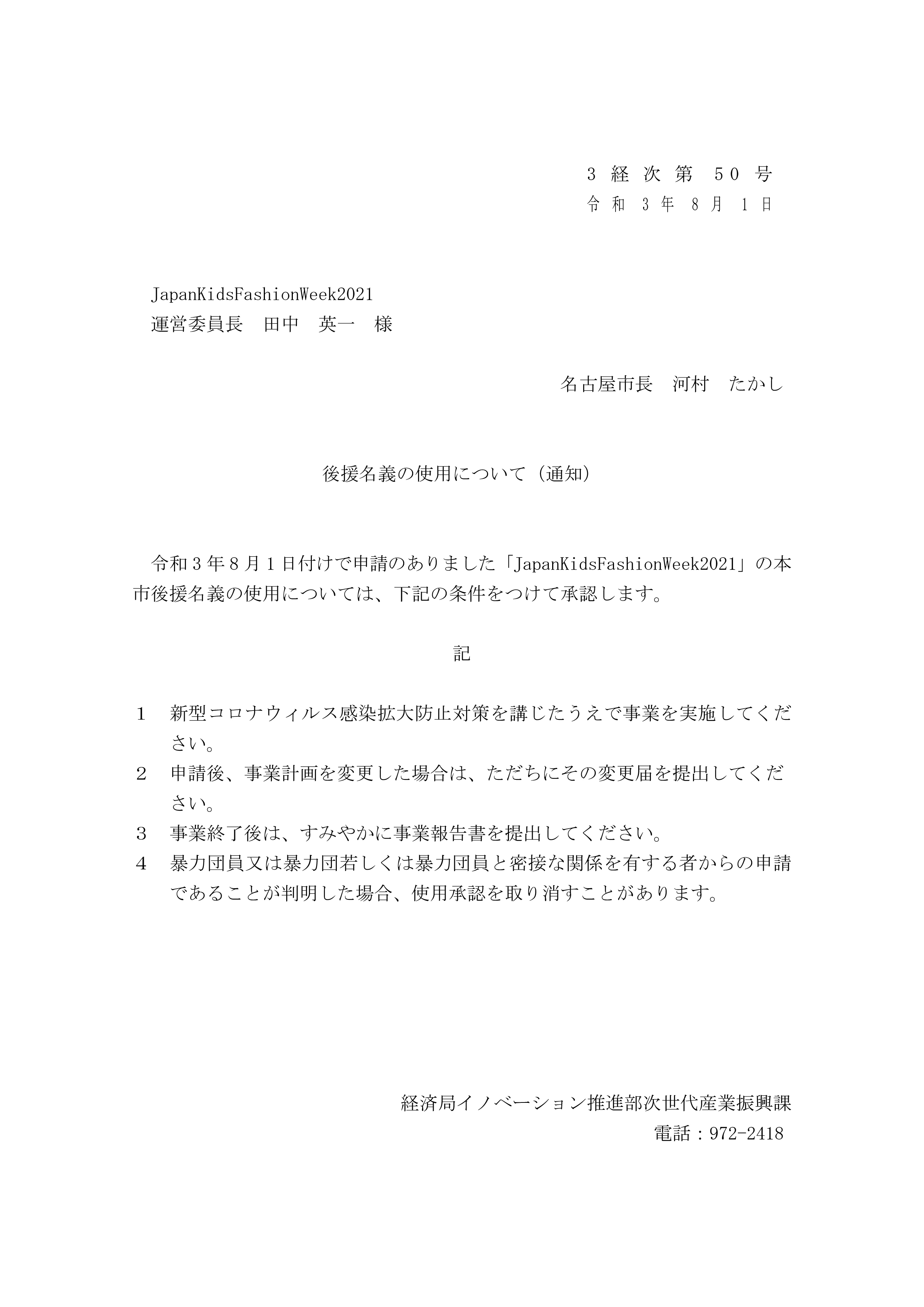 『JKFW2021』の公益性が認められ、名古屋市及び名古屋市教育委員会からの後援をいただきイベントを開催いたします。こんな時期だからこそ、日本の未来を明るくするために、子どもたちが夢に向かって羽ばたける社会を築いていきます
