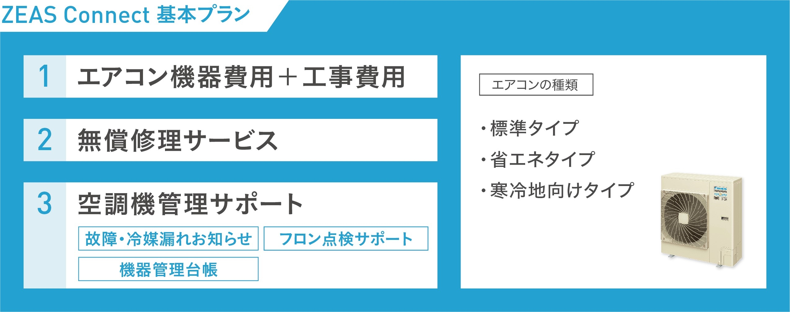 1.エアコン導入の初期費用や万一の修理費用、法定点検などの管理工数を大幅に抑える基本プラン