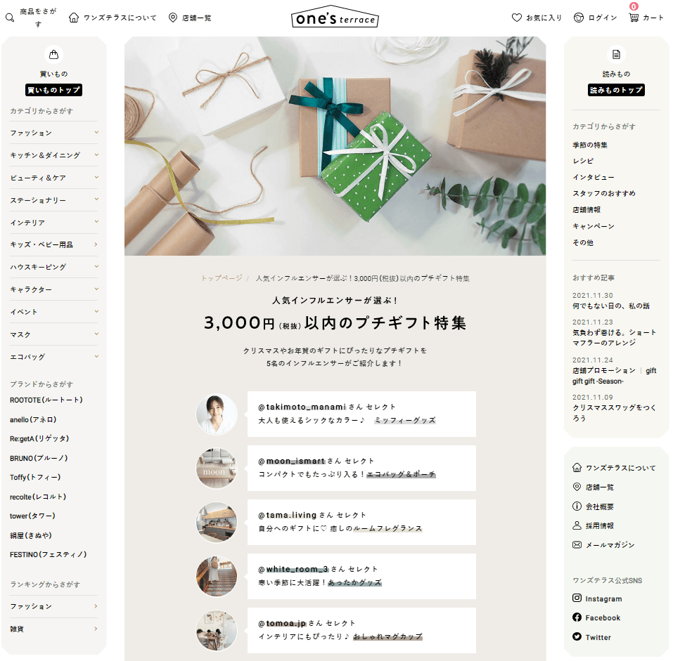 「one’sterrace(ワンズテラス)」人気インフルエンサーおすすめ!“3,000円以下のプチギフト特集”