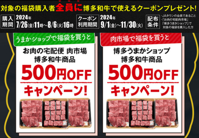 「JAタウン」のショップ「お肉の宅配 肉市場」と「博多うまかショップ」で博多和牛応援キャンペーンを実施中! ~対象の福袋購入で相互割引クーポンをプレゼント!~