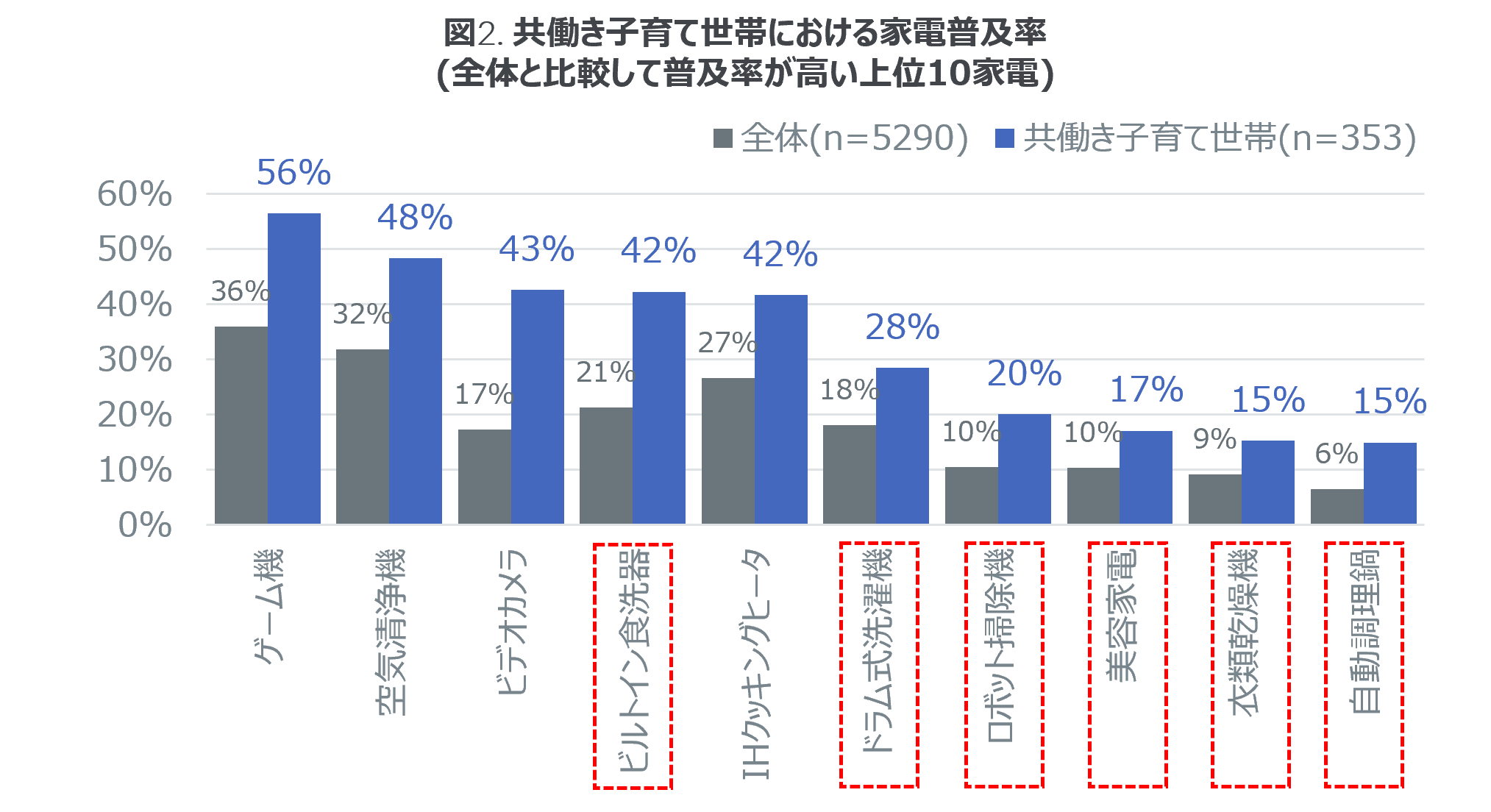 ・共働き子育て世帯では、ビルトイン食洗器、ロボット掃除機、ドラム式洗濯機など家事負担を減らす家電の普及率が全体と比べて1.5~2倍ほど高かった。