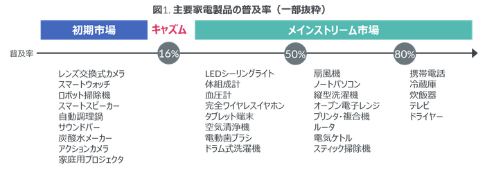 メインストリーム市場の中でも、普及率16%~50%のアーリーマジョリティ市場には、LEDシーリングライトをはじめ、体組成計、血圧計、電動歯ブラシといった健康家電の他、完全ワイヤレスイヤホンやタブレット端末、またドラム式洗濯機が挙がった。