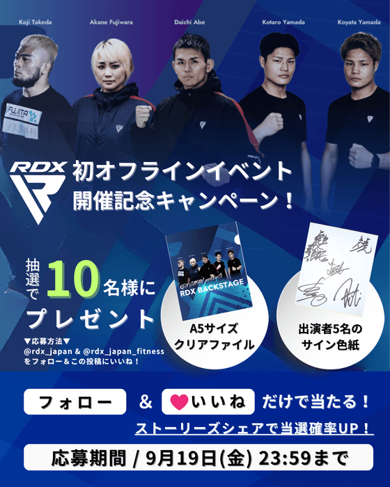 RDX JAPAN 初のオフラインイベント開催を記念して、出演アスリート5名のサイン入り色紙と特別クリアファイルのセットが抽選で10名に当たるキャンペーンを開催します。キャンペーンは、Instagramにて開催します。Cycleが運営する「RDX® SPORTS」の公式Instagramアカウントをフォローし、かつキャンペーン投稿を「いいね」とコメントするだけで参加できます。すでにフォローしている方は「いいね」のタップおよびコメントのみで応募することができます。期間は2025年9月12日(金)〜9月19日(金)23:59まで。当選者の発表はDMでお知らせします。