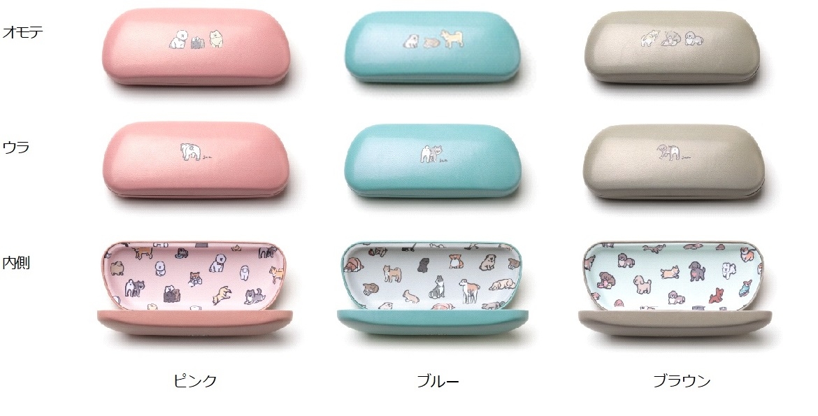 メガネケースの外側は裏表ワンポイントの印刷でシンプルにし、内側には元気なワンちゃんが集まる柄を施しています。