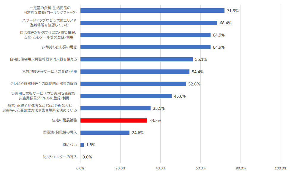 一方で、災害時の安否確認方法や住宅の耐震補強の実施率は低い傾向であり、まだまだ耐震化を進めて行く必要性があるといえます。
