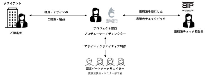 このような背景から、ビズテーラー・パートナーズでは、日本全国に広告バナー・LP(ランディングページ)の制作を中心とした300名以上のパートナークリエイターを抱えるクリエイターズマッチと連携して、市場ニーズに応えられる「薬機法広告に対応できるクリエイターの育成システム」と「第三者チェックを組み込んだ薬機法広告制作サービス」を開発し、消費者に信頼される広告クリエイティブを提供してまいります。