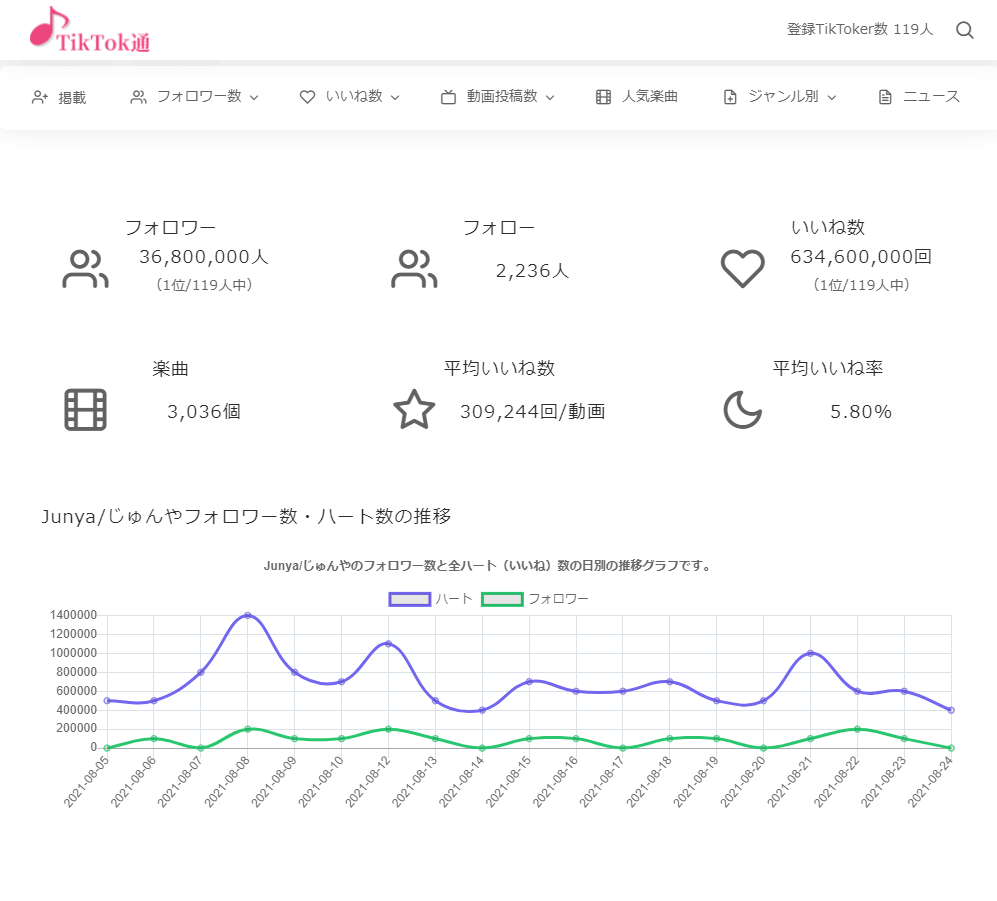 TikTok通に登録されたTikTokerの中からいいね数が多い順に表示します。