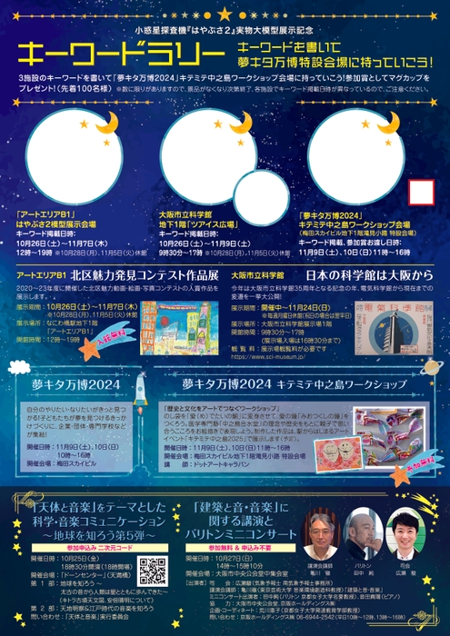 さらに「はやぶさ2」模型展示を記念して展示会場の「アートエリアB1」、「大阪市立科学館」、大阪市北区主催の「夢キタ万博2024」会場の3つの施設をめぐるラリーを開催します。