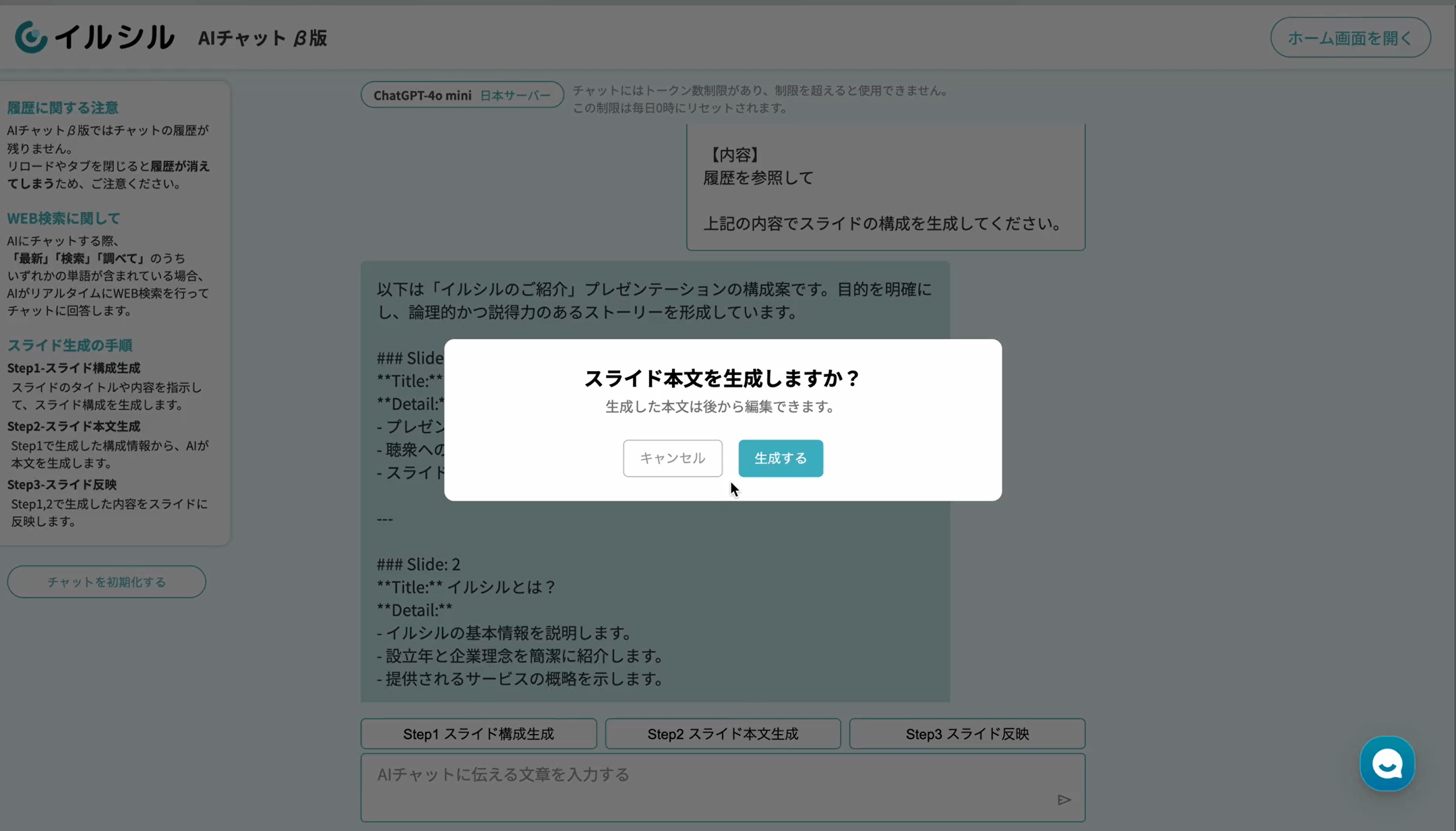 「イルシル」サービス内でAIとのチャットからスライドをAI生成できる機能を追加しました。