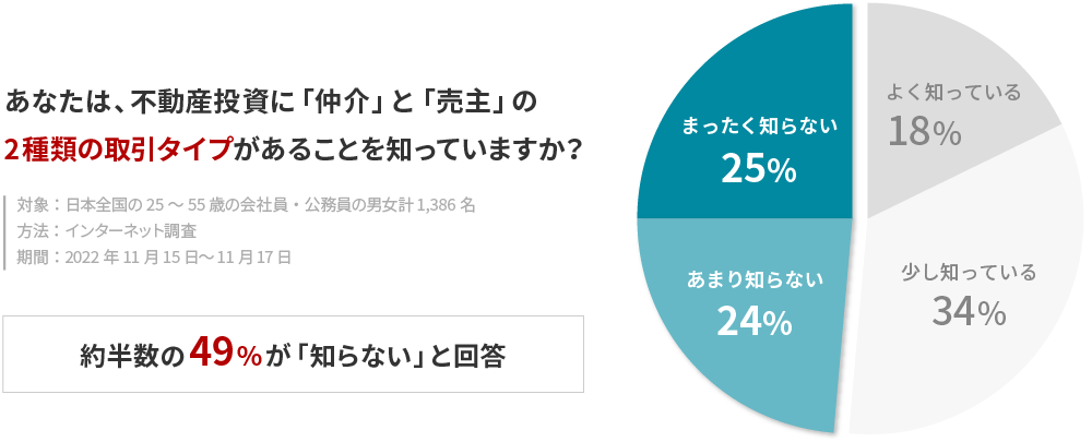 全国の会社員・公務員の男女計1,386名に対して行った今回の調査では、不動産投資の成否に大きな影響を及ぼす「仲介」と「売主」の取引タイプについて、全体の約半数となる49%がその存在自体を認知していないという事実が判明したほか、これらの取引タイプについて、10人中7人が「丁寧な説明」を求めていることが明らかになりました。