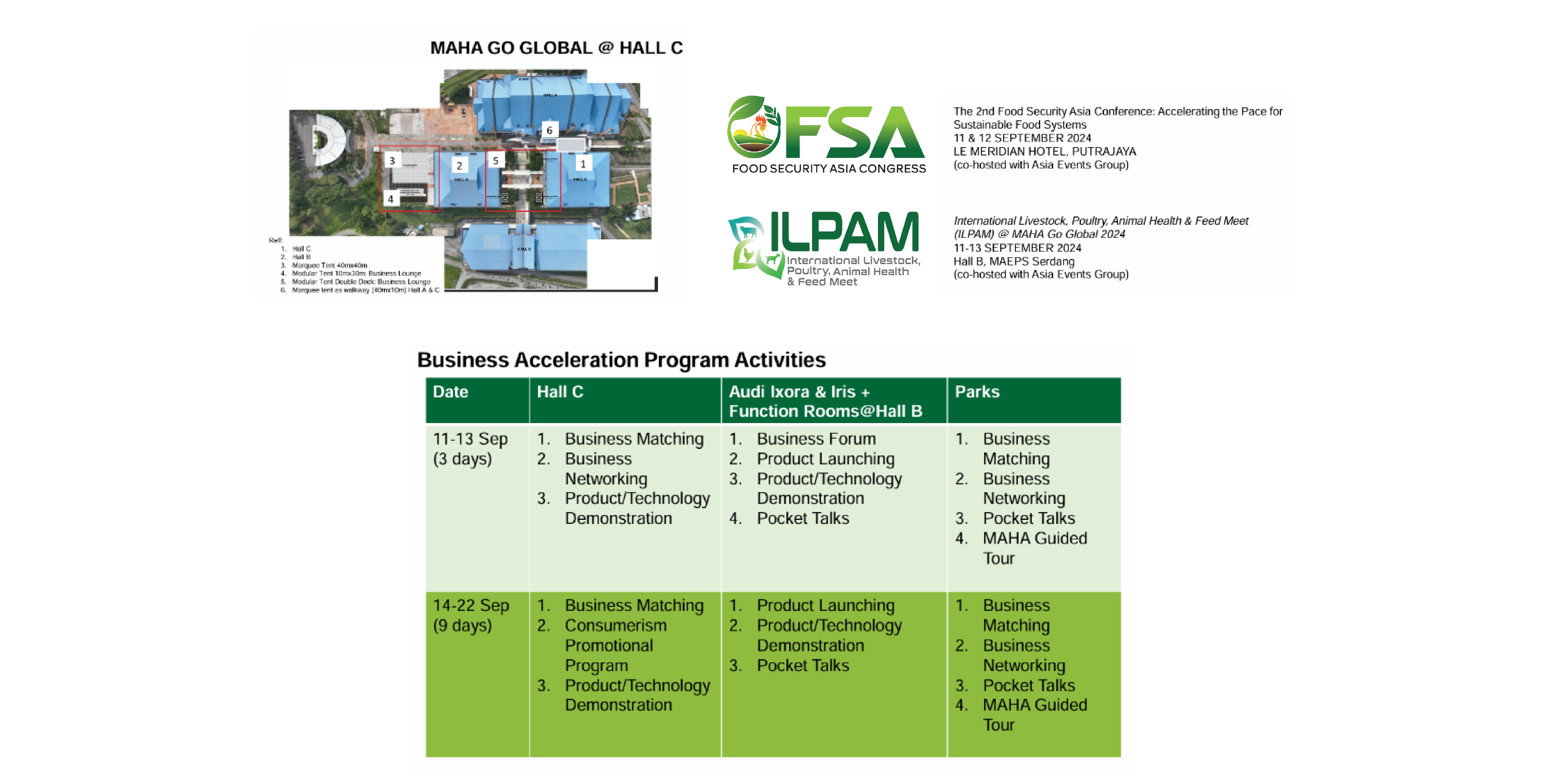 MAHAは、マレーシア最大の農業展示会で、マレーシア農業食糧安全保障省(MAFS)が主催し、隔年で開催されます。MAHA 2024は、MAHA 100周年記念、農業、持続可能性、人材、テクノロジー、アグロツーリズム、MAHA Go Globalと投資に焦点を置いています。「夢が咲く明日を収穫する」をテーマとするMAHA 2024は、国際的な参加を増やし、食糧安全保障分野における回復力の開発を促進し、若者が農業業界を収入源として考えられるためのイベントを目指しています。