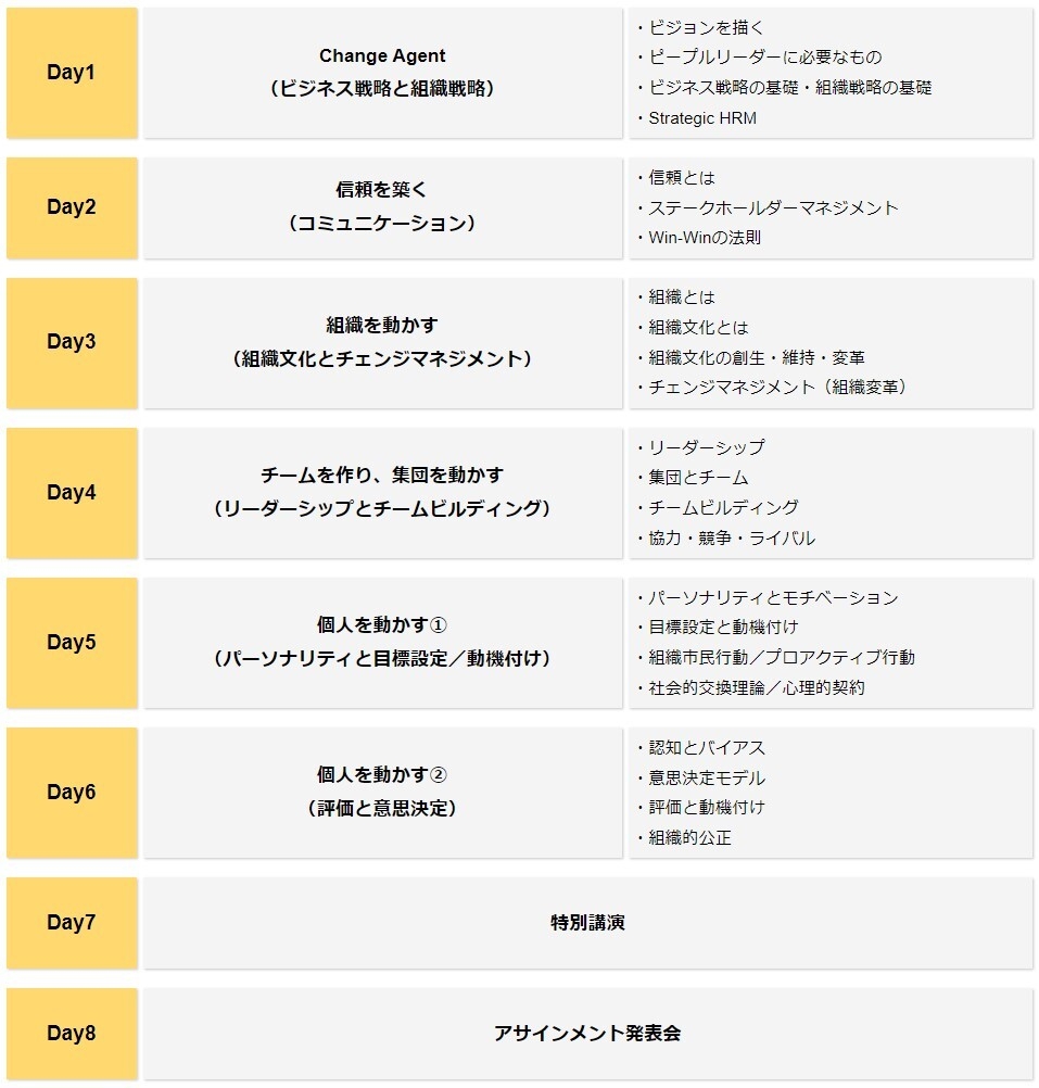 Day1からDay8までの8講座構成となっており、ピープルマネジメントの原理原則並びに組織変革の全体像とプロセスを理解し、集団、個人の理解を深め、受講生同士での議論により具体的なアクションプランを設計していきます。