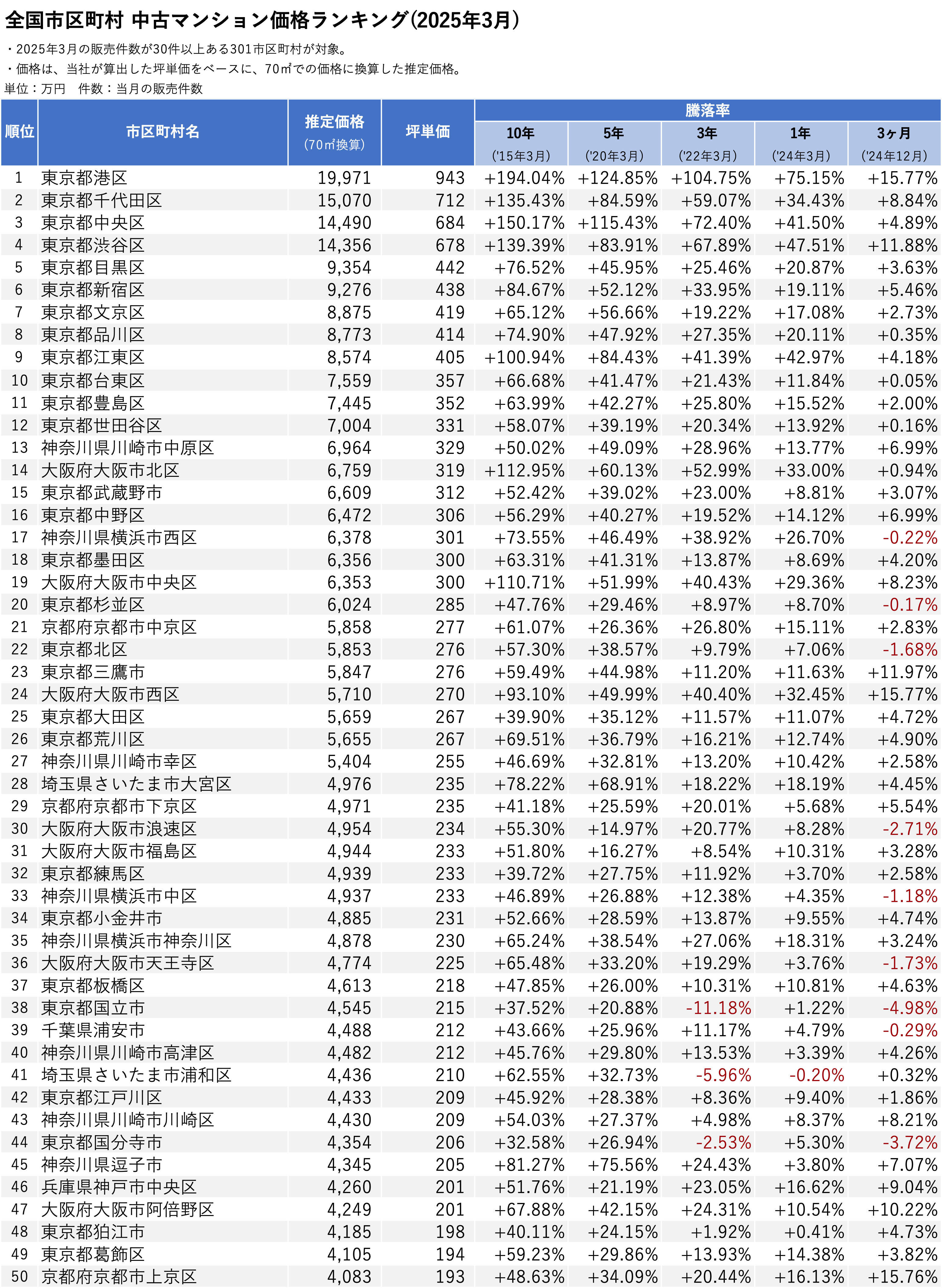 「マンションレビュー」2025年3月 全国市区町村 中古マンション価格/騰落率ランキングを発表