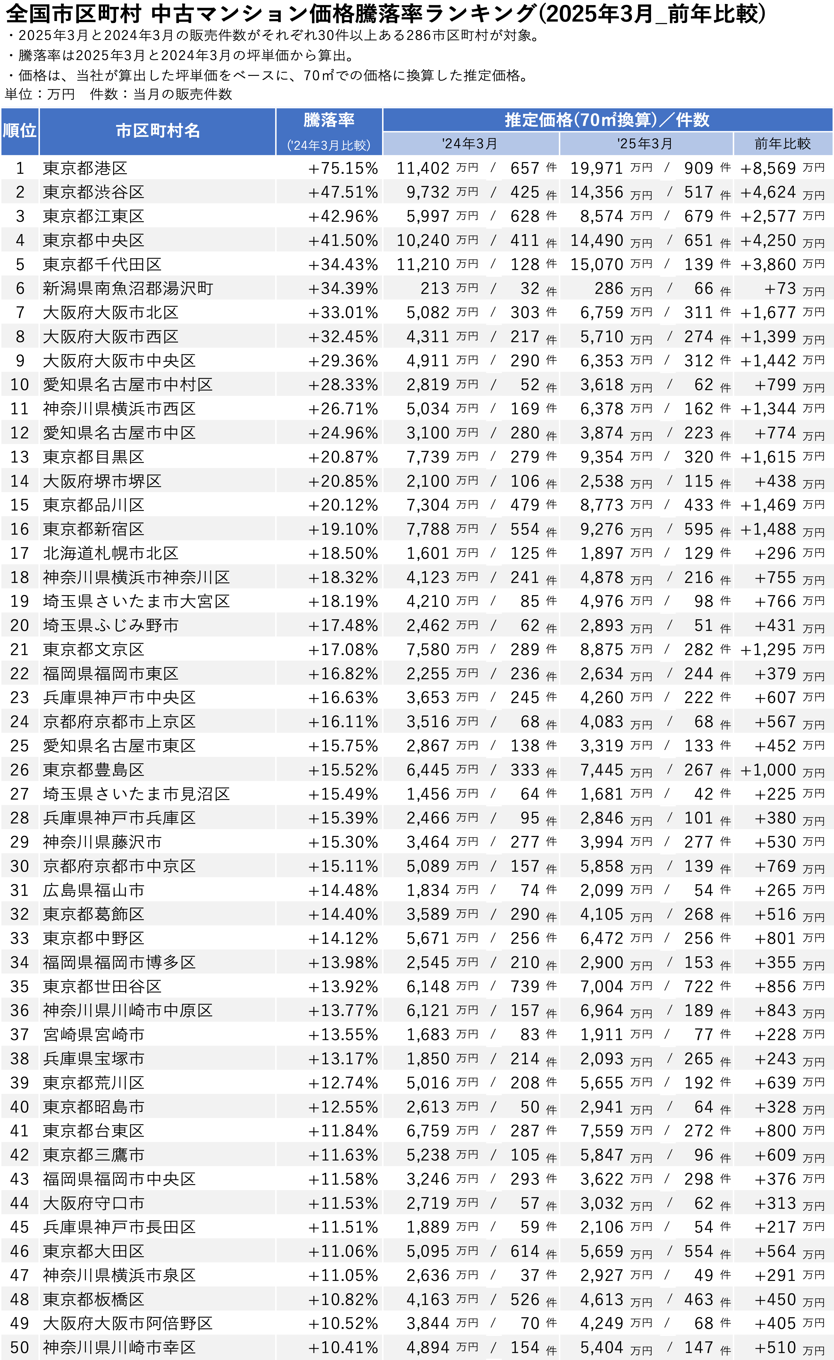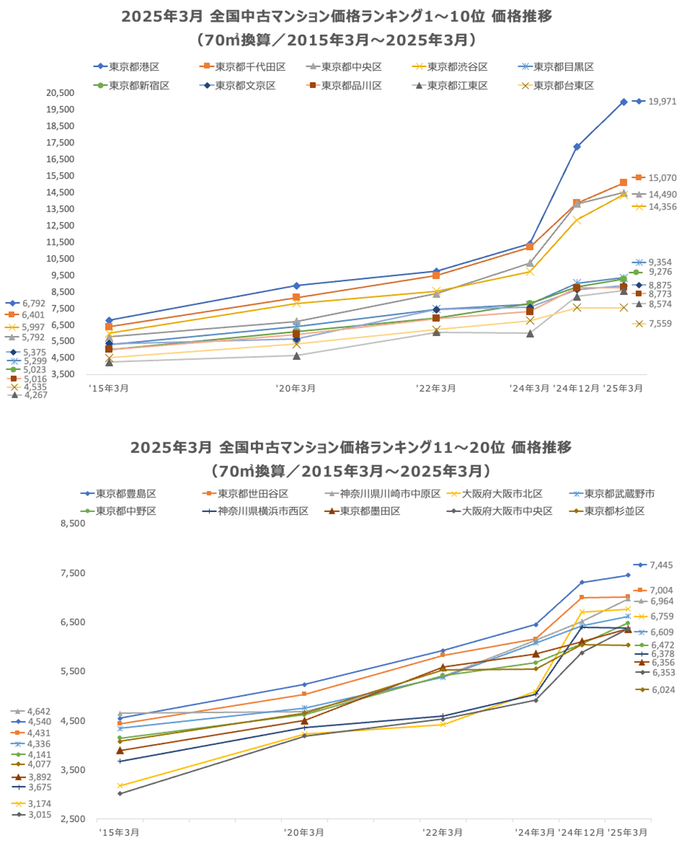 「不動産×WEB×ビッグデータ」の領域で、さまざまな不動産テックサービスを展開する株式会社ワンノブアカインド(本社:東京都港区、代表取締役社長:川島 直也、以下当社)は、当社が運営するマンション情報サイト「マンションレビュー」の保有データを元に、2025年3月の全国市区町村における中古マンションの相場を調査。坪単価をベースに70㎡の価格に換算した「中古マンション価格」*1と価格ランキング上位20件について過去10年間の価格推移、および1年前からの価格上昇率を表す「騰落率」のランキングを発表いたします。