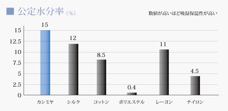 カシミヤなどの動物繊維の表面を覆っているスケール(キューティクル)は、開閉して空気中の水分を取り込んだり吐き出したりするため、快適な湿度を保つように調整してくれます。これは天然繊維ならではの快適さで、化学繊維にはない特徴です。JISの公定水分率で、カシミヤ繊維は他の繊維より高い吸湿保温性が分かります。