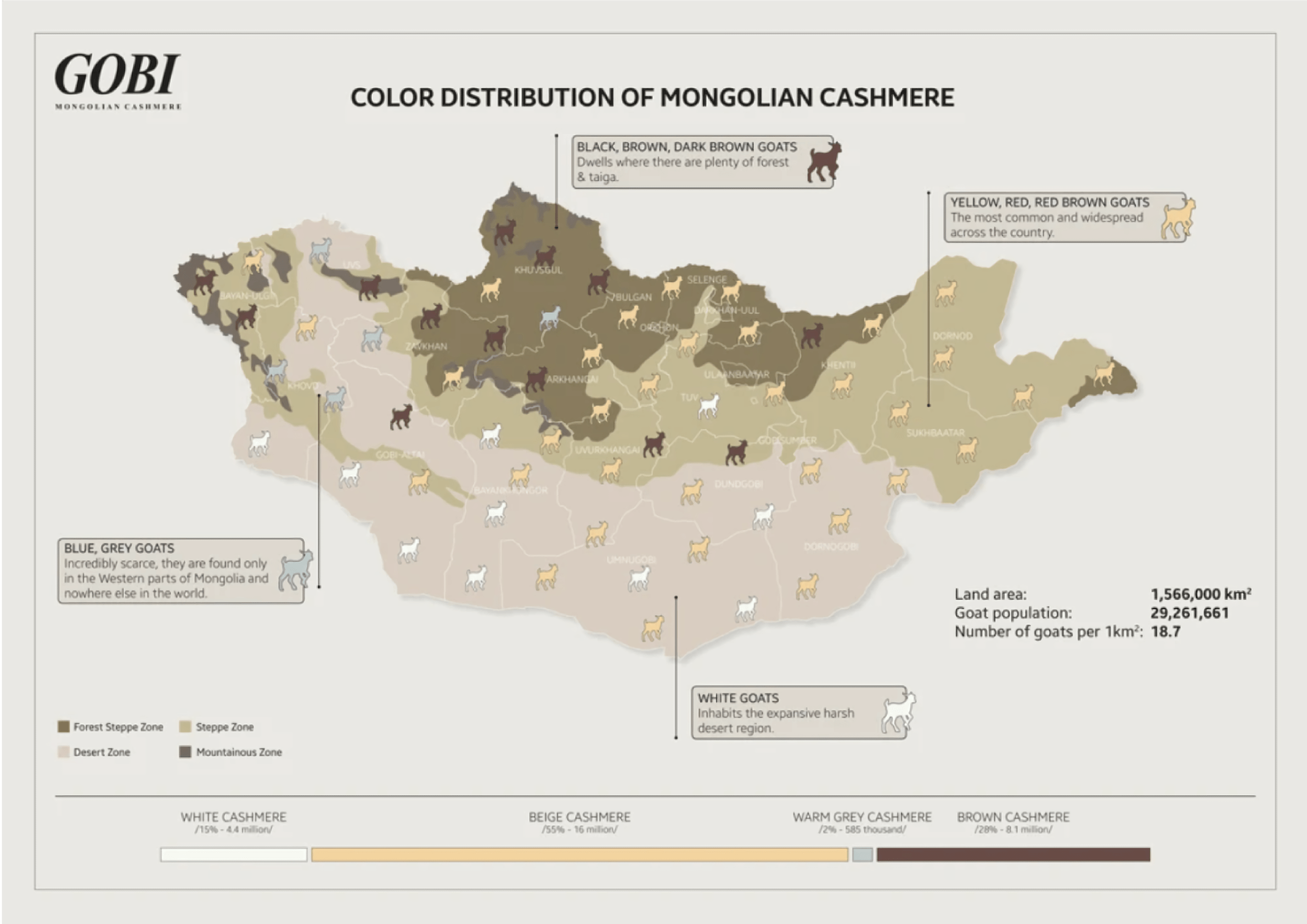 近年、インターネット上では中国製の安価なカシミヤ製品が出回っていますが、それらとは比べものにならない上品なツヤと極上の肌触り。デパートや高級セレクトショップで扱っている高価なカシミヤ製品と比べても同レベルです。それはそのはず。ヨーロッパやアメリカを中心に世界のカシミヤブランドへカシミヤ原毛を提供しているのは、この「GOBI CASHMERE(ゴビカシミヤ)」なのです。(全てのカシミヤブランドへ提供しているわけではありません)