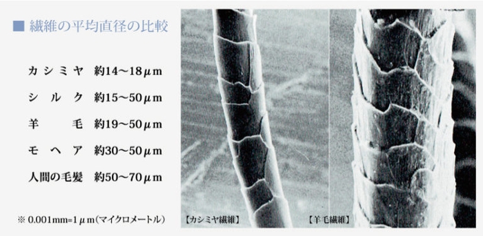 カシミヤ繊維の平均直径は14μm(μmは1/1000ミリ)前後と、羊毛や他の動物繊維に比べて細いため、チクチクと皮膚を刺激しません。一番細い高級羊毛のジロンラムでも16μm、エクストラファインウールは19.5μm、メリノウールは23μm、アルパカは24〜31.5μm、モヘヤはもう少し太くて30〜50μmですので、その細さは毛素材で一番細いといえます。そして、羊毛に比べると伸縮率が40%以上も高いため、生地や製品になったときに、しなやかでとても柔らかい肌触りがうまれます。