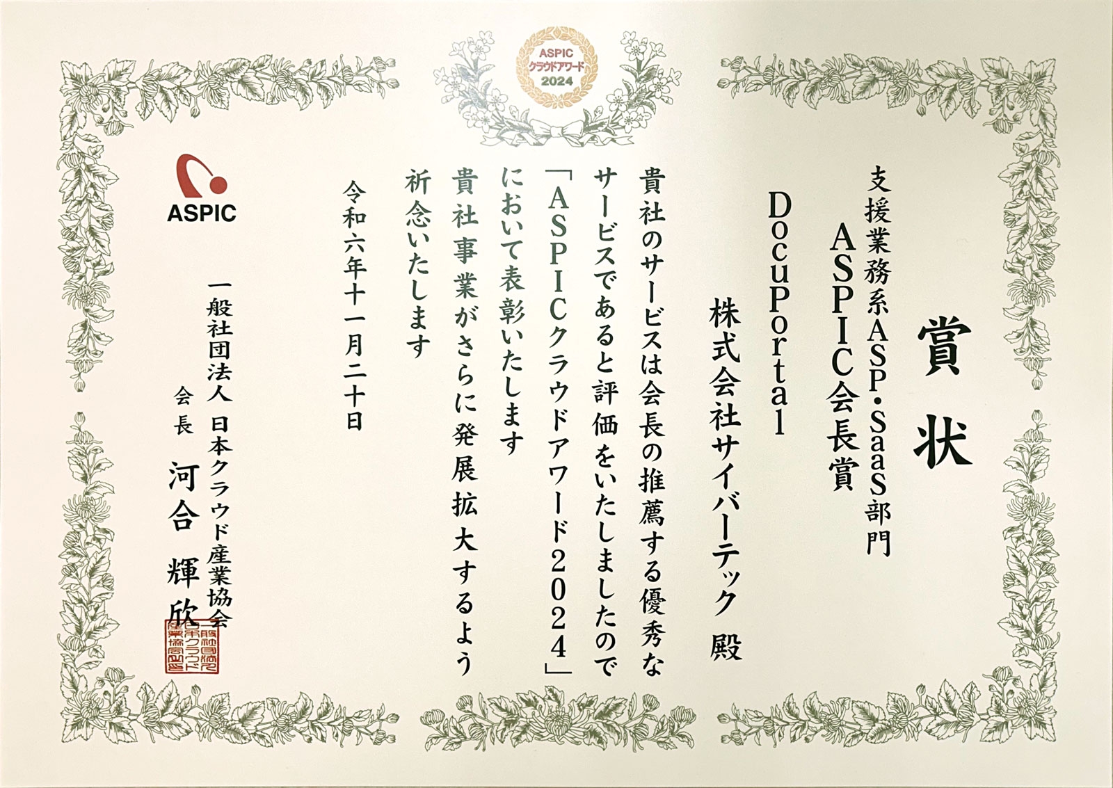 ITで企業のDX対応をサポートする株式会社サイバーテック(代表取締役社長:橋元 賢次 本社:東京都渋谷区、以下サイバーテック)が提供する、ドキュメント公開ポータルシステム「DocuPortal」が、11月20日に一般社団法人日本クラウド産業協会(本社:東京都品川区 会長:河合 輝欣 以下「ASPIC」)が主催する「第18回 ASPICクラウドアワード2024」において、ASPIC会長賞を受賞した事をお知らせします。
