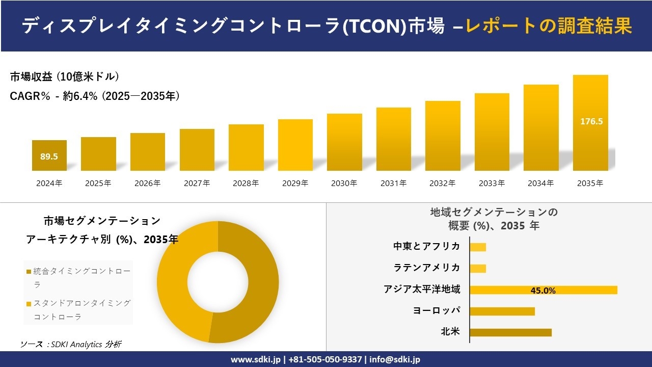 提出日 (2025年10月08)、SDKI Analytics(本社:渋谷区、東京都)は、2025年と2035年の予測期間を対象とした「ディスプレイタイミングコントローラ(TCON)市場」に関する調査を実施しました。