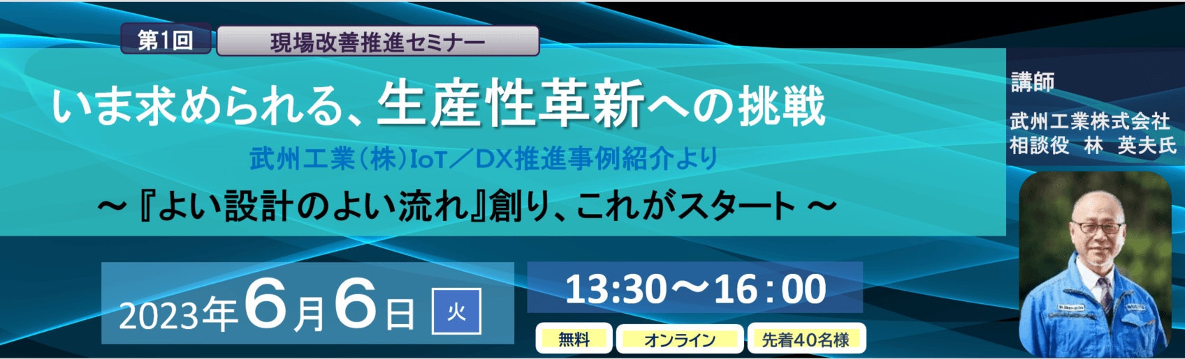 本セミナーでは、実際にDX(デジタルトランスフォーメーション)に取組む武州工業株式会社 相談役の林 英夫氏を講師にお迎えし、生産性革新の根幹をなす「人材育成の重要性」と、「『よい設計のよい流れ』の重要性」について、同社のIoT/DX推進事例も絡めながらお話しいただきます。