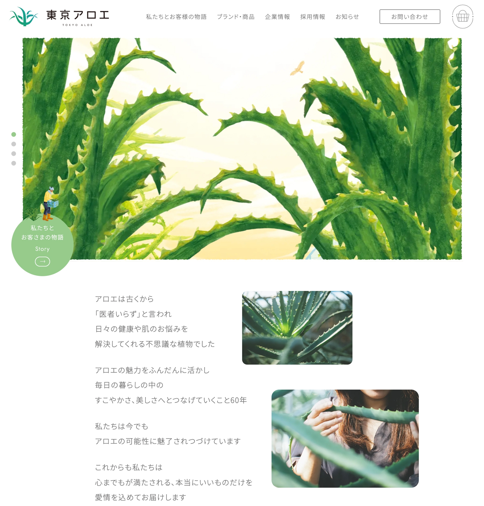 アロエのグリーンを印象的に映し出す、光あふれる空間をイメージし、白やベージュを基調としたすっきりと洗練されたデザイン。随所にほどこした繊細な手描きのイラストレーションが、当社のものづくりにかける想いやこだわりを演出しています。