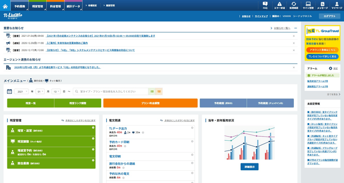 宿泊施設の予約・販売管理システム『TL-リンカーン』は、旅行会社とネット販売からの通知を一元管理し、残室・料金管理が一括でできるASPサービスであり、現在約5,000軒の宿泊施設でご活用いただいております。