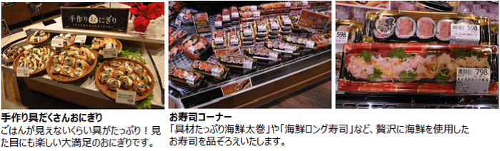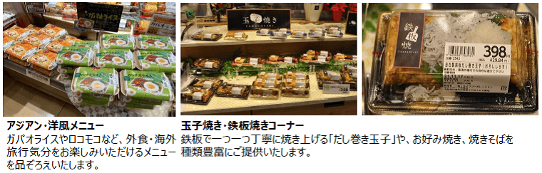 通勤や通学で駅を利用される方が多いため、惣菜の品ぞろえに力を入れ、ヘルシー系からガッツリメニューまでライフ自慢のお弁当やお寿司を種類豊富に品ぞろえいたします。また、手作りニーズにお応えする鮮度抜群の生鮮食品や、単身・共働き世帯のお客様向けに、便利な時短・簡便商品を豊富にご用意いたします。
