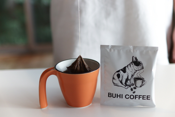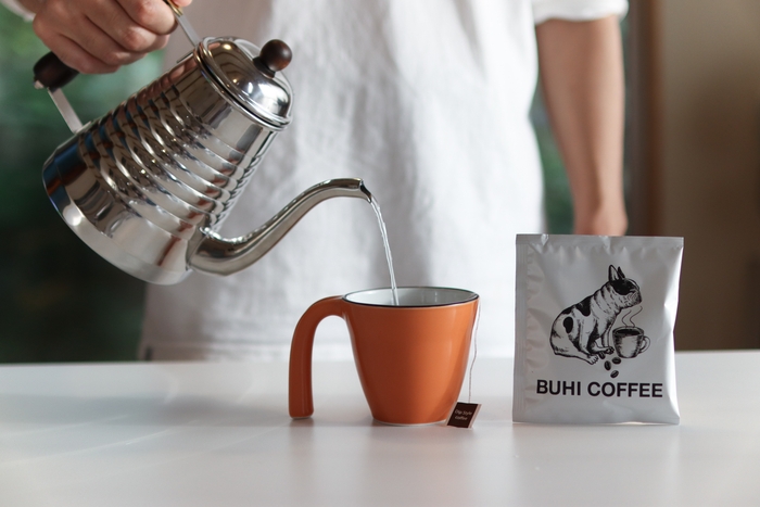 「BUHI COFFEE」は、世界一のバリスタである、粕谷哲氏の監修によるオリジナルコーヒーです。本格的な味でありながら、カップにお湯を注ぐティーバッグタイプとなっており、紅茶を入れるように簡単に作ることができます。また、ナッツの香ばしさがするコーヒー豆を使用することで、飲んだ時の鼻から抜ける香りが「まるで肉球のような」風味を楽しめるように仕上げております。さらに、犬の健康を阻害するカフェインを99.9%カットしているため、愛犬と暮らすオーナーも安心してお飲みいただけます。「BUHI COFFEE」は、愛犬とのくつろぎのひと時を、そしてより多くの方にもホッと一息ついていただきたい、そんな思いを込めた商品です。
