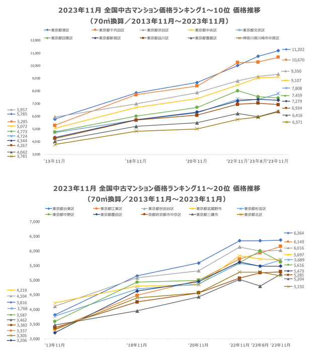 調査。坪単価をベースに70㎡での価格に換算した「中古マンション価格」*1と価格ランキング上位20件について過去10年間の価格推移、および1年前からの価格の上昇率を表す「騰落率」のランキングを発表いたします